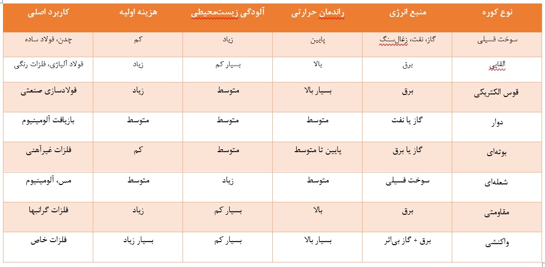 در این مقاله به معرفی و بررسی انواع اصلی کورههای ذوب شامل کوره سوخت فسیلی، کوره القایی، کوره قوس الکتریکی، کوره دوار، کوره بوتهای، کوره شعلهای، کوره مقاومتی و کوره واکنشی پرداخته میشود و در پایان، مقایسهای میان آنها از نظر بهرهوری انرژی و اثرات زیستمحیطی ارائه خواهد شد.